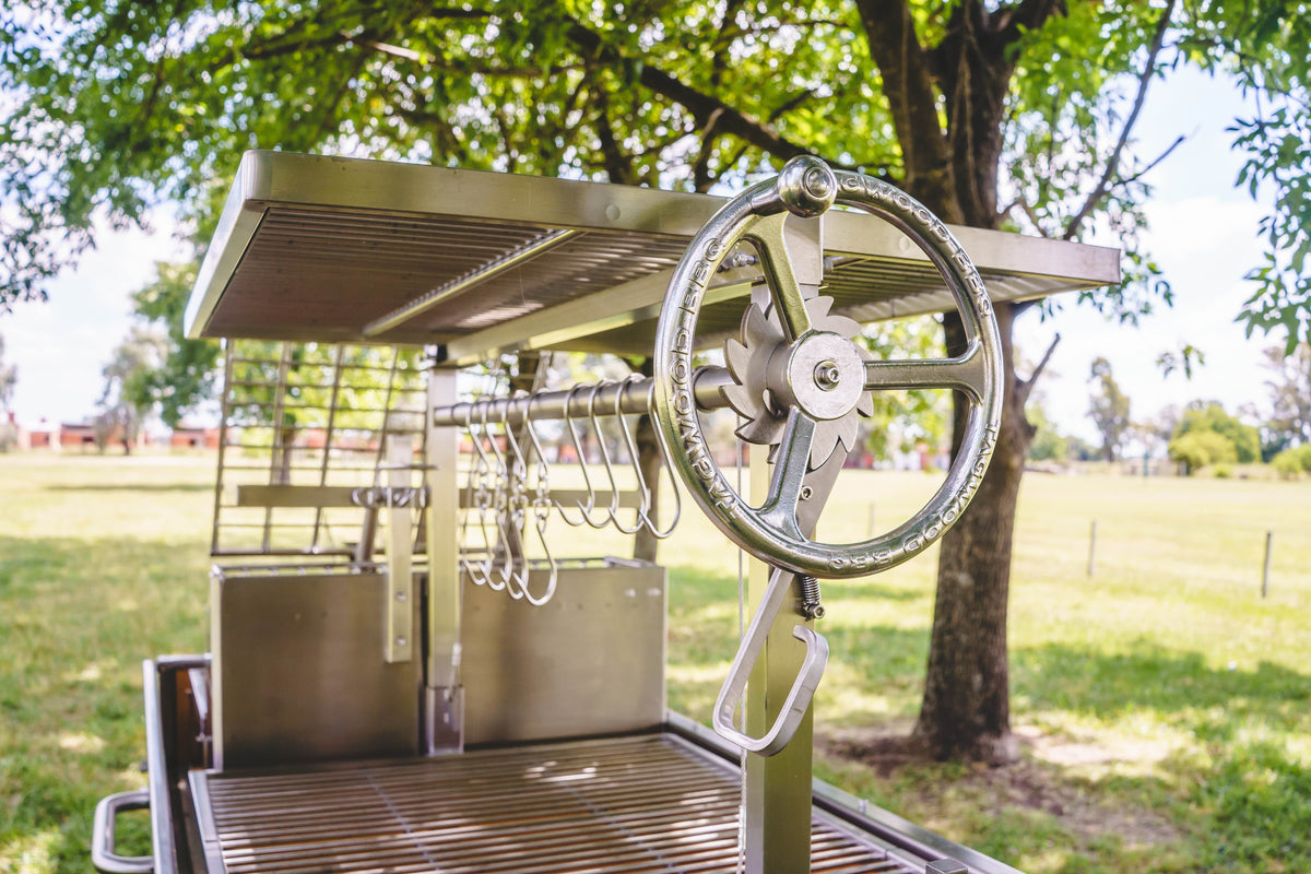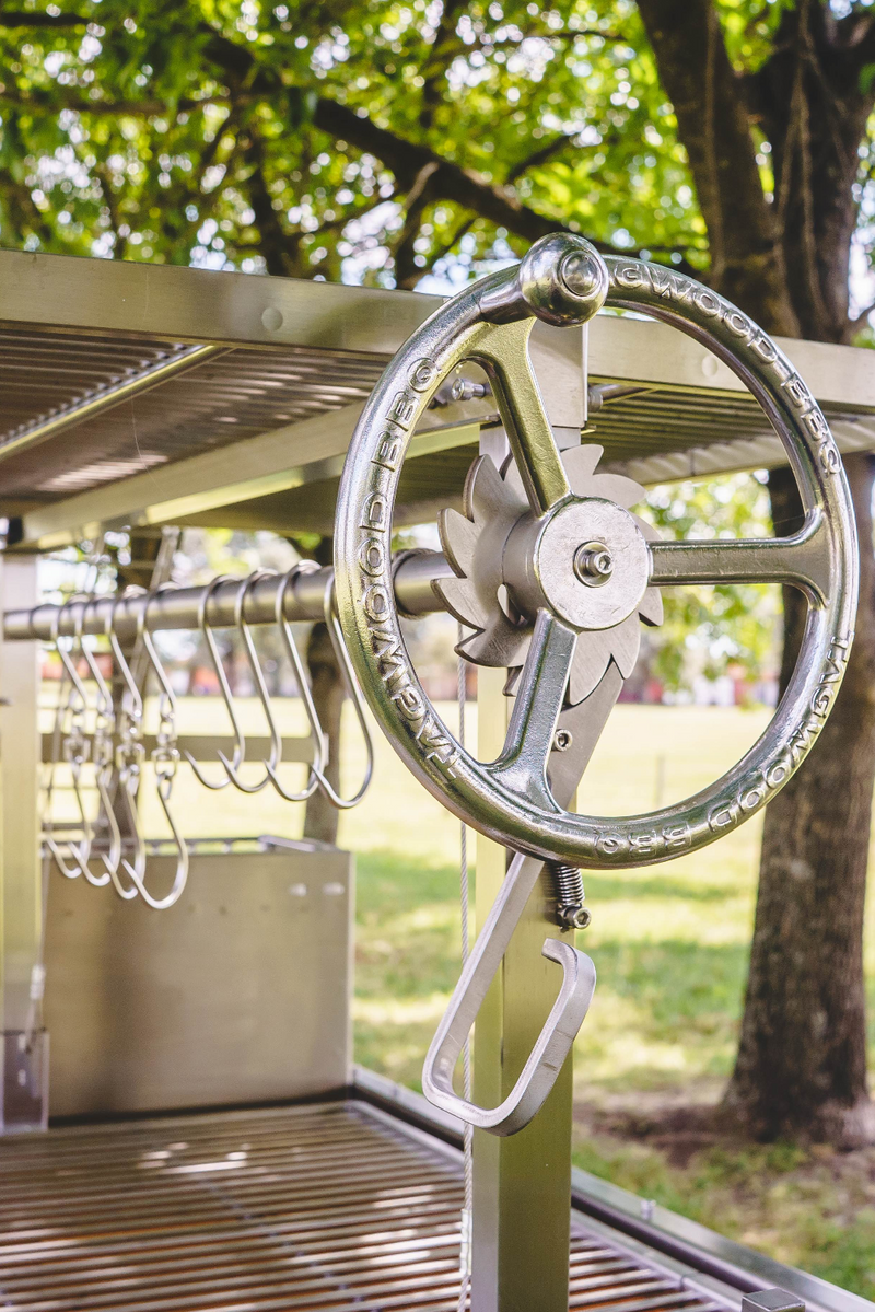 By simply releasing the lower lock, we can rotate the entire grill clamp and thus be able to lower, raise, and/or rotate our meats with total ease, and most importantly, away from the fire. Designed for enjoyment at all times.